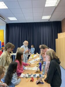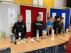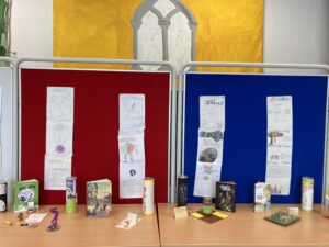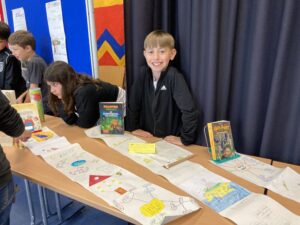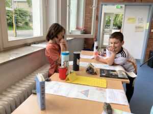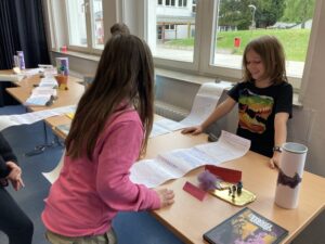 In diesem Jahr stellten die Kinder der Klasse 4b im Deutschunterricht ein selbstgewähltes Buch mithilfe einer Leserolle vor: Sie erstellten dazu Seiten mit Infos, Fotos und Bildern, klebten diese wie eine Schriftrolle aneinander und steckten sie in eine leere Chipsrolle. Im Kunstunterricht wurde die Rolle von außen passend zum Buch gestaltet und Gegenstände gebastelt, die in der jeweiligen Geschichte eine Bedeutung haben. Schließlich stellten die Kinder ihre „gesammelten Werke“ begeistert für alle Klassen in der Aula aus.